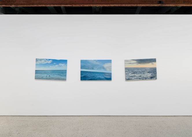 Tilted Seascapes (2024), three paintings of tilted horizon;