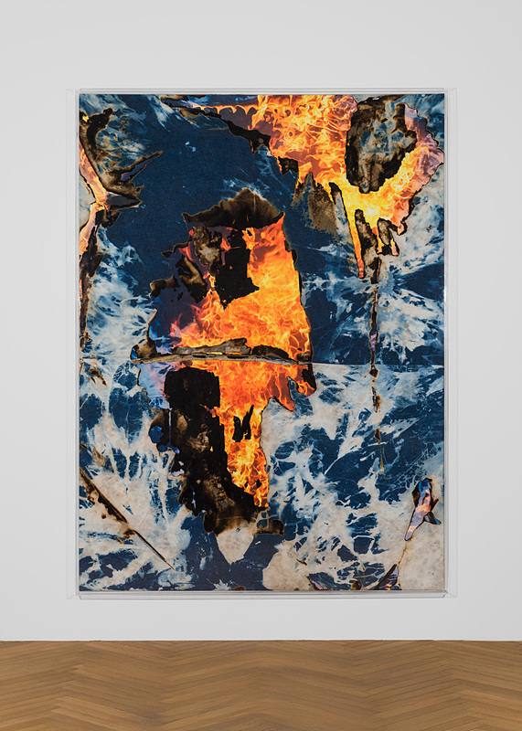 Among the exhibited works, Jean-Michel Othoniel’s Gold Lotus (2021), a stainless-steel bead sculpture cast in gold leaf, evokes empathy and recovery from discrimination and marginalization, like a lotus blooming from the mud. As an extension, Julian Opie’s two LED works from the Old Street Couple series align with the theme of alienation in contemporary society, evoking the emotions and stories of contemporary city dwellers through their continuous walking motions. Korakrit Arunanonchai presents Untitled (History Painting) (2021), a painting on denim scorched in flame in the process. The resulting work comprises the remnants of the burnt painting, ash, and photographs documenting the fire, revealing reflections on human history, memory, and Western-centric globalization and labor.